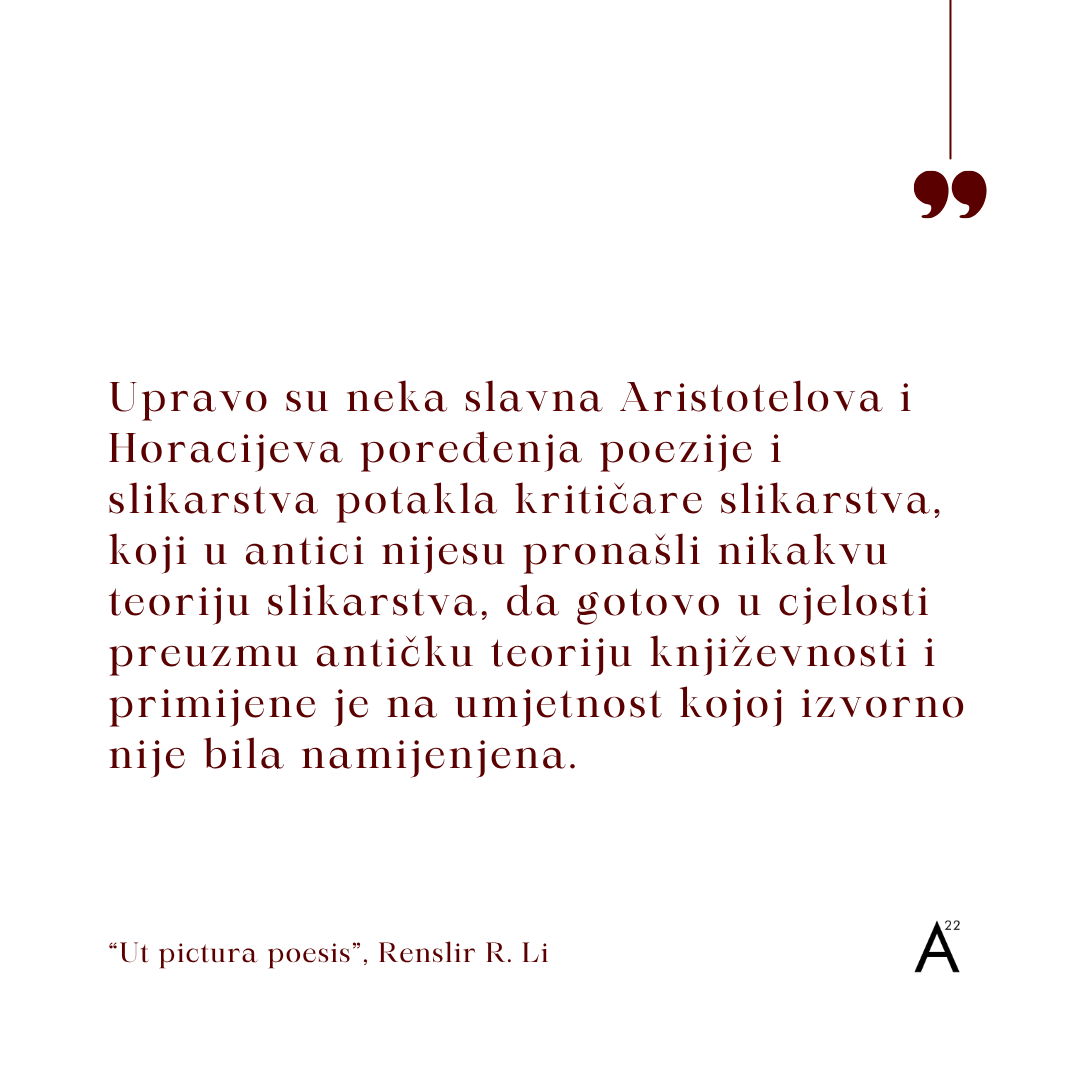 Ova studija istražuje složen i višeslojan odnos između slikarstva i poezije u periodu od XV do XVIII vijeka, prateći način na koji su antičke književne teorije, posredovane kroz renesansnu i baroknu misao, oblikovale evropsku umjetnost. Polazeći od ideja Horacija i Aristotela, autor razmatra koncept ut pictura poesis, prema kojem se slikarstvo i poezija posmatraju kao „sestrinske umjetnosti“ – discipline koje dijele zajedničku svrhu: otkrivanje univerzalnih istina o ljudskoj prirodi.